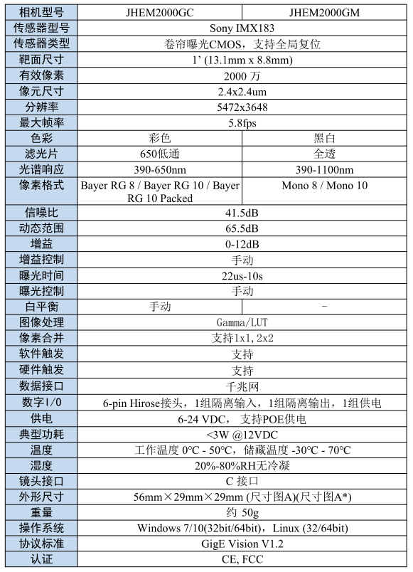 兼容 GigE Vision 1.2 协议/POE供电或6-24V宽压DC供电/千兆网接口/最大传输距离100米/最高速度 1Gbps/高品质 CMOS 传感器/内置 128M帧缓存/支持 ROI 功能/支持硬件触发和软件触发/支持闪光灯或者IO输出